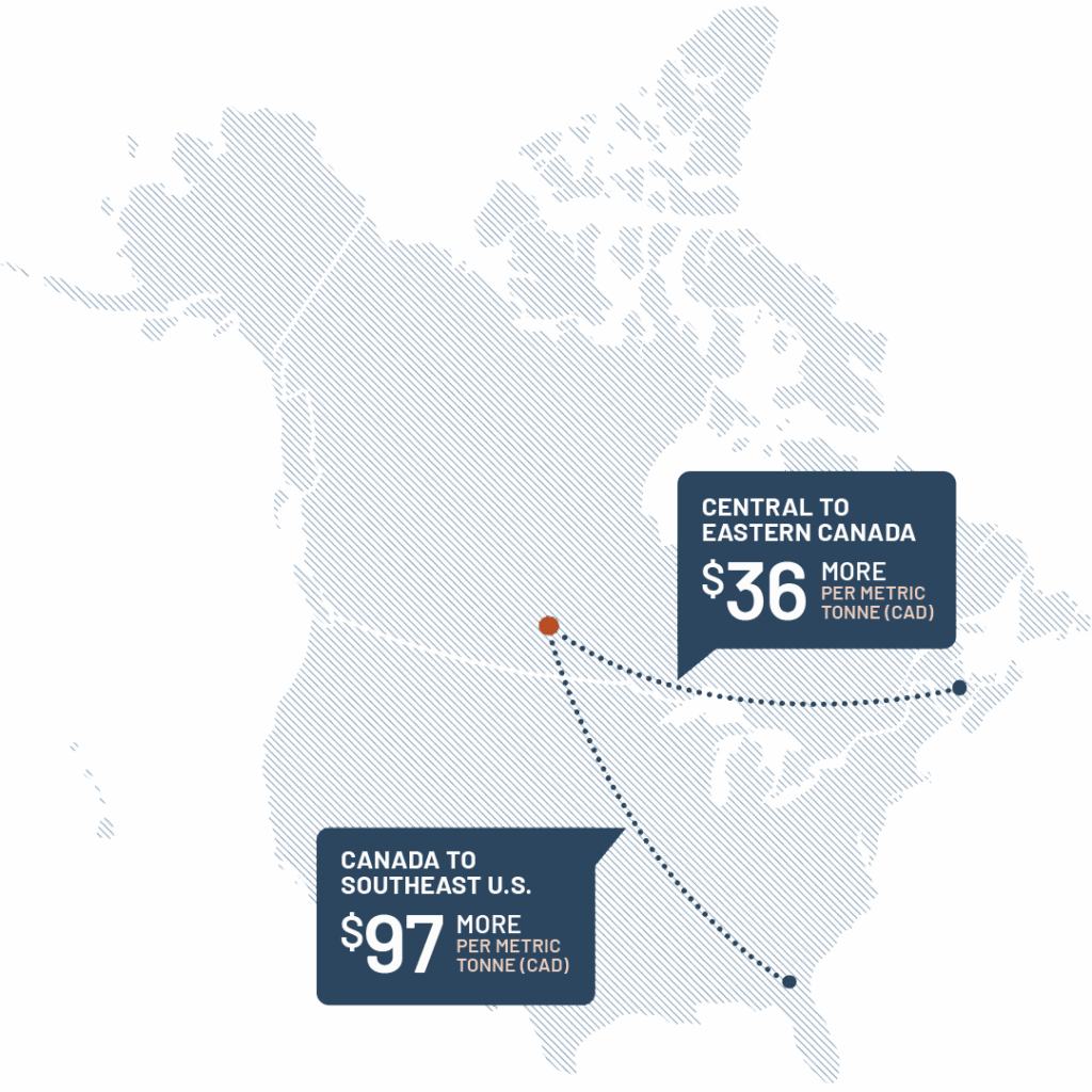 Once filled in Canada, cars move by rail to main hubs like Winnipeg or Chicago for domestic transport.